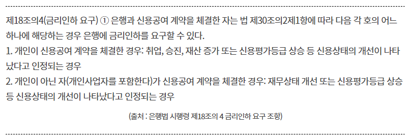 대출을 받은 금융기관에 해당 대출상품의 금리를 인하해 달라고 요구할 수 있는 법적권리를 말합니다. 대출거래 약정 당시와 비교하여 신용상태의 개선등 일정한 요건에 해당하는 고객이 은행이 정하는 절차에 따라 금리인하를 요구할 수 있는 제도로 2019년 6월 12일부터 법제화가 되었으며, 아래와 같이 은행법 시행령 제18조 4 금리인하 요구조항이 있습니다. 만약 금융회사가 금리인하요구권을 미리 안내하지 않은 경우 금융회사에는 최대 1,000만 원의 과태료가 부과된다.