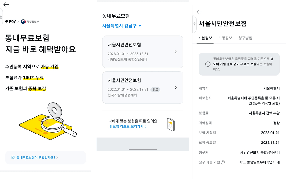 시민안전보험은 내가 살고 있는 지역에 주민등록을 둔 대한민국 국민이라면 누구나 자동으로 100% 무료로 자동으로 가입되어 있는 보험을 말합니다. 일상생활에서 발생할 수 있는 각종 재난 사고로 부터 피해를 입은 시민들의 생활안정과 복지 향상을 위해 마련된 장치로, 지방자치단체가 가입해 보험료 전액을 부담하여 대한민국 전체 97% 지역이 시민안전보험에 가입 중인 것으로 알려져 있습니다. 카카오페이는 시민안전보험을 각 지방단체 시민이 더 편리하게 접근할 수 있도록 행정안전부와 협업하여 '동네무료보험' 서비스를 준비했다고 합니다.